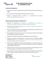 ÊTRE TRANSPORTEUR POUR LE CORONER EN CHEF CRITÈRES D’ADMISSIBILITÉ • Être titulaire d’un permis de directeur des services funéraires (en vigueur) délivré par le MSSS; • Offrir un service de…