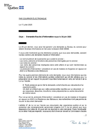 PAR COURRIER ÉLECTRONIQUE Le 17 juillet 2025 Objet : Demande d’accès à l’information reçue le 30 juin 2025 Le 29 juin dernier, vous avez fait parvenir une demande au Bureau du coroner pour…