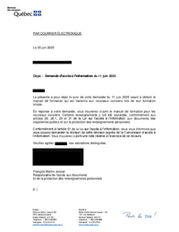 PAR COURRIER ÉLECTRONIQUE Le 30 juin 2025 Objet : Demande d’accès à l’information du 11 juin 2025 , La présente a pour objet le suivi de votre demande du 11 juin 2025 visant à obtenir le manuel de…
