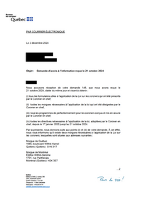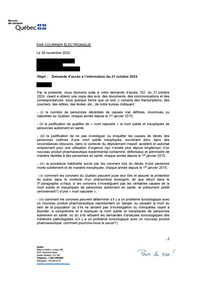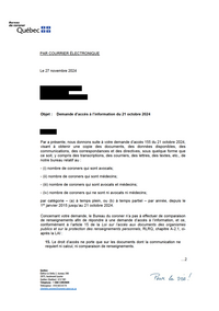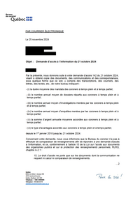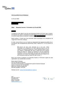 PAR COURRIER ÉLECTRONIQUE Le 23 août 2024 Objet : Demande d’accès à l’information du 22 août 2024 La présente a pour objet le suivi de votre demande d’accès du 22 août visant à obtenir les…