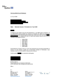 PAR COURRIER ÉLECTRONIQUE Le 3 juillet 2024 Objet : Demande d’accès à l’information du 12 juin 2024 La présente a pour objet le suivi de votre demande d’accès du 12 juin 2024, et visant à obtenir…