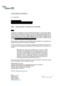 PAR COURRIER ÉLECTRONIQUE Le 17 juillet 2024 Objet : Demande d’accès à l’information du 11 juillet 2024 , La présente a pour objet le suivi de votre demande d’accès du 11 juillet visant à obtenir…